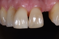 Missnöje med stora mellanrum och färg samt 1 saknad tand. Behandling: Generell blekning samt 2 kronor och 1 bro på 4 tänder i överkäken.