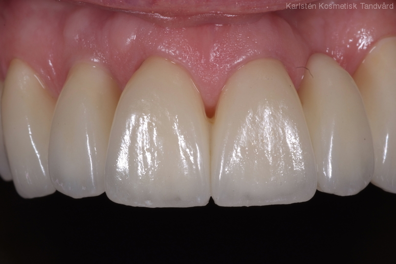 Missnöje med stora mellanrum och färg samt 1 saknad tand. Behandling: Generell blekning samt 2 kronor och 1 bro på 4 tänder i överkäken.