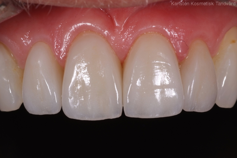 Slitna tänder med fyllningar och missfärgningar. Behandling: Generell blekning, 2 kronor på höger sida samt 4 fasader.