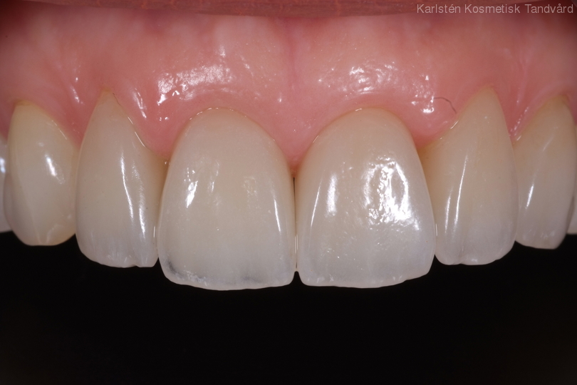 2 gamla kronor som inte stämmer riktigt i form samt oregelbunden tandrad. Behandling: Generell blekning samt 5 porslinskronor.