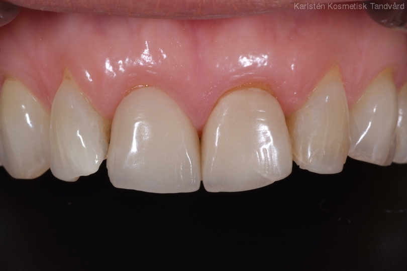 2 gamla kronor som inte stämmer riktigt i form samt oregelbunden tandrad. Behandling: Generell blekning samt 5 porslinskronor.